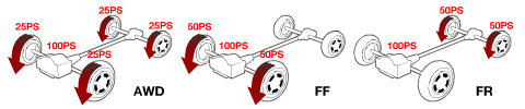 FF(前置發(fā)動機(jī)、前輪驅(qū)動)及FR(前置發(fā)動機(jī)、后輪驅(qū)動)等2WD(Two Wheel Drive:2輪驅(qū)動)車型只使用4個車輪中的2個進(jìn)行驅(qū)動。即假如動力為100馬力的2WD車,一個驅(qū)動輪要承受50馬力的動力。由于路面狀況不同,有時動力會超出驅(qū)動輪的抓地力而出現(xiàn)車輪打滑現(xiàn)象。