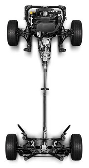 車身前后的重量平衡是把握車輛主動安全性的關(guān)鍵。左右對稱全時四輪驅(qū)動系統(tǒng)(Symmetrical AWD)本來就有重量輕的優(yōu)勢,再加上將變速器及分動器等配置在前后輪之間,因此,實現(xiàn)了完美的前后重量分配。