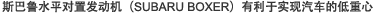斯巴魯水平對置發(fā)動機(SUBARU BOXER)與普通的其他類型發(fā)動機相比,總長度較低,而且重量輕、結(jié)構(gòu)緊湊。在降低車輛重心、提升主動安全性(保持行駛、轉(zhuǎn)彎、制動時的穩(wěn)定性)方面極具優(yōu)勢。