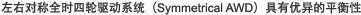 一般來說,四輪驅(qū)動方式的結(jié)構(gòu)易趨于復(fù)雜,而左右對稱全時四輪驅(qū)動系統(tǒng)(Symmetrical AWD)的簡潔緊湊在平衡方面具有很大的優(yōu)勢