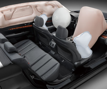 除了用于保護前座乘員胸部和頭部的SRS側面安全氣囊,還有用于保護前后座乘員頭部的簾式安全氣囊。當車身側面受到強烈碰撞時,安全氣囊展開,覆蓋住幾乎全部的前后側門窗和中心柱。保護了乘員的安全,同時也降低了碰撞后被甩出車身的可能性。